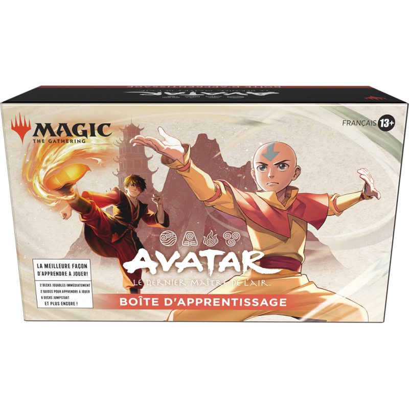 Initiez-vous à Magic, le pionnier des jeux de cartes à collectionner, grâce à cette boite d'apprentissage. Elle contient 2 decks d'apprentissage de 20 cartes chacun avec un thème Aang et un thème Zuko, ainsi que 8 demi-decks Jumpstart préfabriqués aux thèmes conçus et sélectionnés spécifiquement pour des joueurs débutants, dans l'univers d'Avatar. Découvrez les règles du jeu grâce à une expérience guidée pour apprendre à jouer qui s'accompagne d'un tutoriel pour vous guider étape par étape dans vos premiers tours.